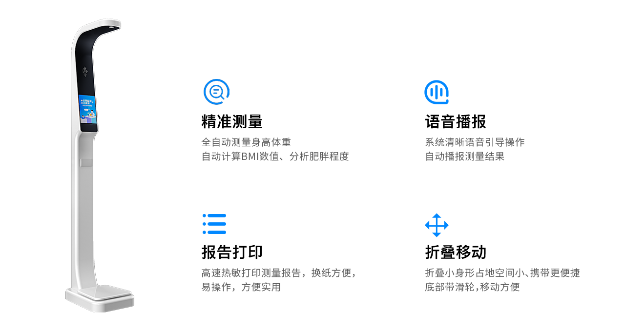 多功能一体化测量,秒级测量基础指标,包括超声波体检、精密平衡梁电阻感应和语音播报功能,操作简便,适用于批量体检需求。