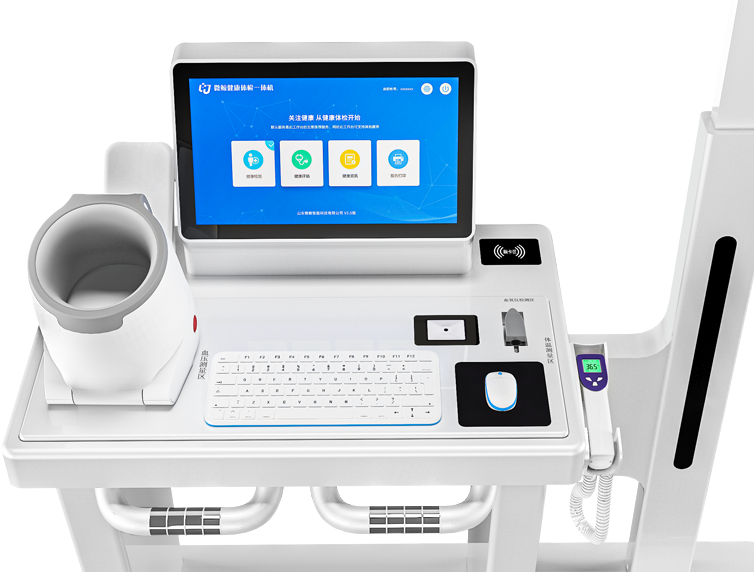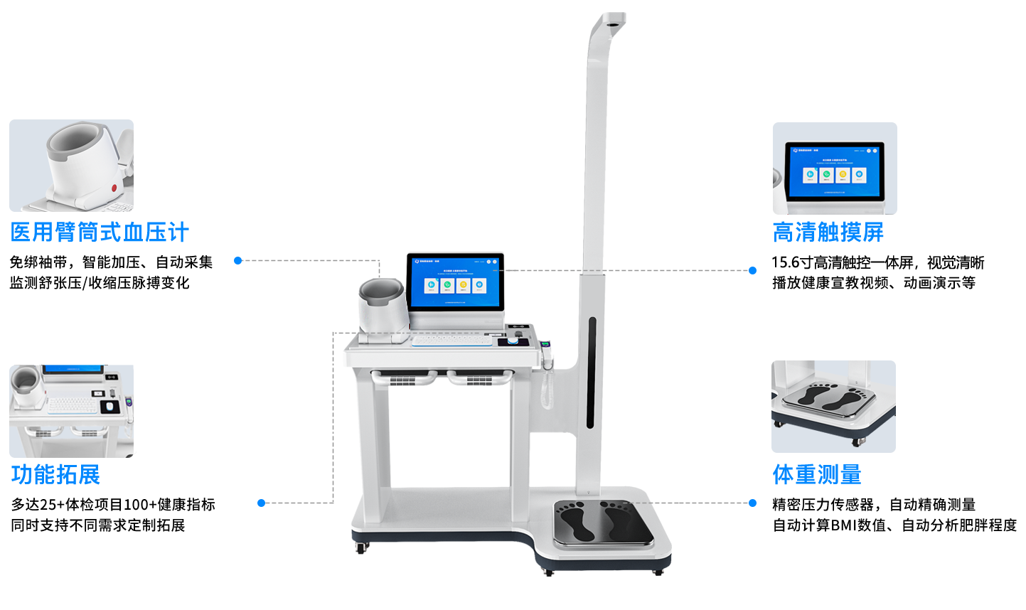 智能登录、自动建档、操作触摸屏、超声波测量、搭配医用级静音轮,轻松移动、在线评估、即时打印体检报告、健康指导建议。