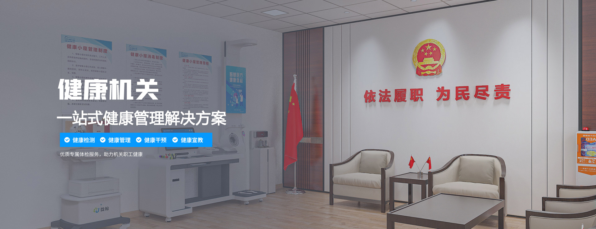 “健康机关解决方案:采用先进、便捷的检测仪器,在机关对终端用户进行体检项目,并实现一系列风险测评及管理、健康咨询、健康方案指导、执行记录、反馈等全流程出发,围绕饮食、运动、生活方式、心理等多维度进行有效的健康管理。